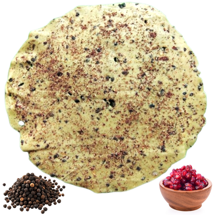 Anardana Papad is made with premium quality urad dal (black gram) dough, crushed black pepper and the tangy real Anardana (dried pomegranate seeds). This papad offers a satisfying crunch that’s both delicious and digestive friendly.