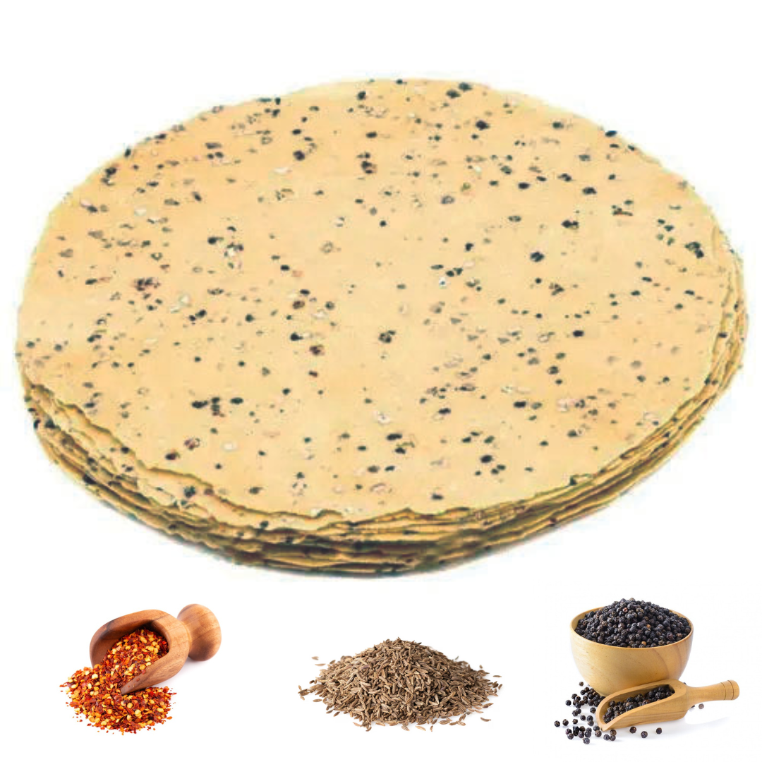 • Medium Spicy BlackPepper Papad (500g) – Packed with a bold, peppery punch that awakens your senses.